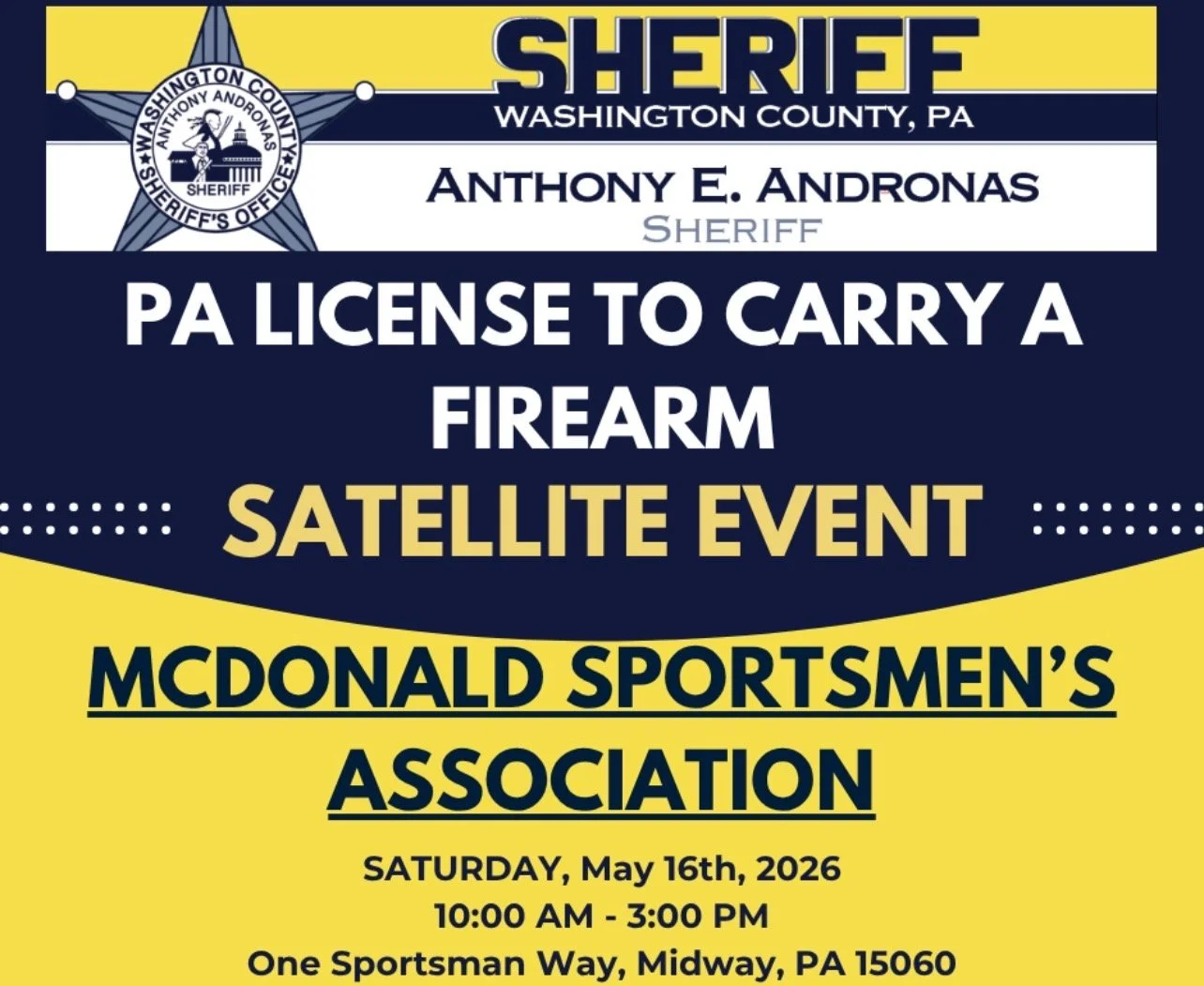 PA License to Carry a Firearm - Satellite Event Saturday, May 16, 2026 10:00 AM 3:00 PM Google Calendar ICS
